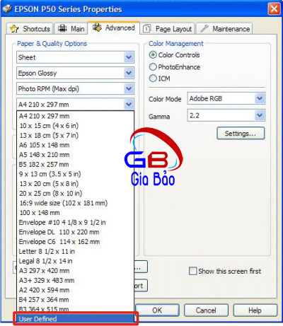 + Chọn khổ giấy có sẵn hoặc bạn tự chỉnh khổ giấy như hình A & B.
